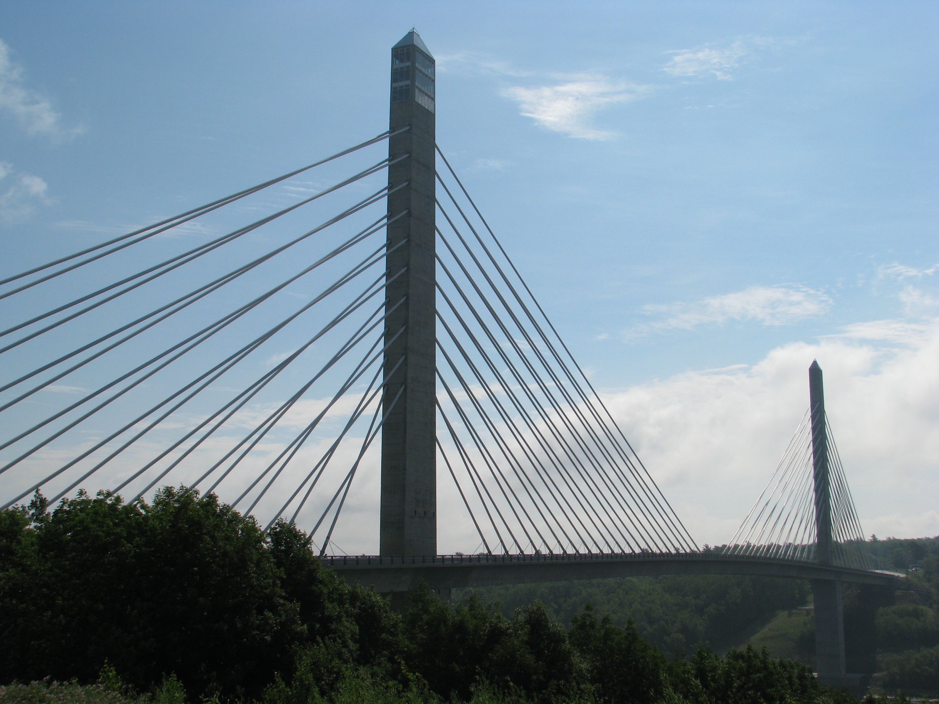 En route we had to cross the Penobscot Narrows Bridge, which turned out to be very interesting. It’s a Verrazano-style bridge with a single row of massive tension cables running through the middle of the length of the bridge. The bridge, which opened in 2006, spans 2,120 feet from shore to shore, is 135 feet above the water and cost $85 million to build. The really interesting part is the observation deck you can ascend via an internal elevator.