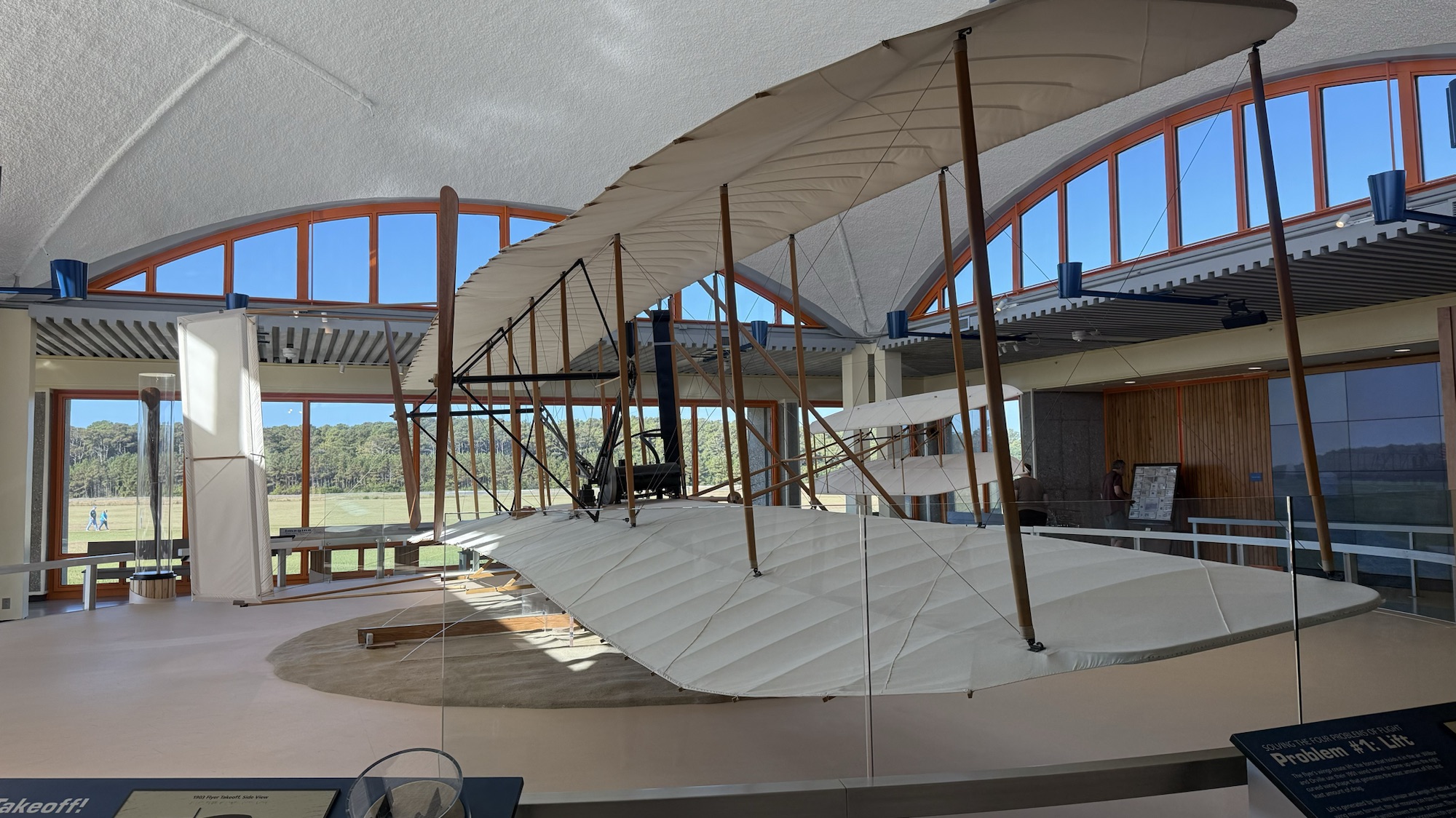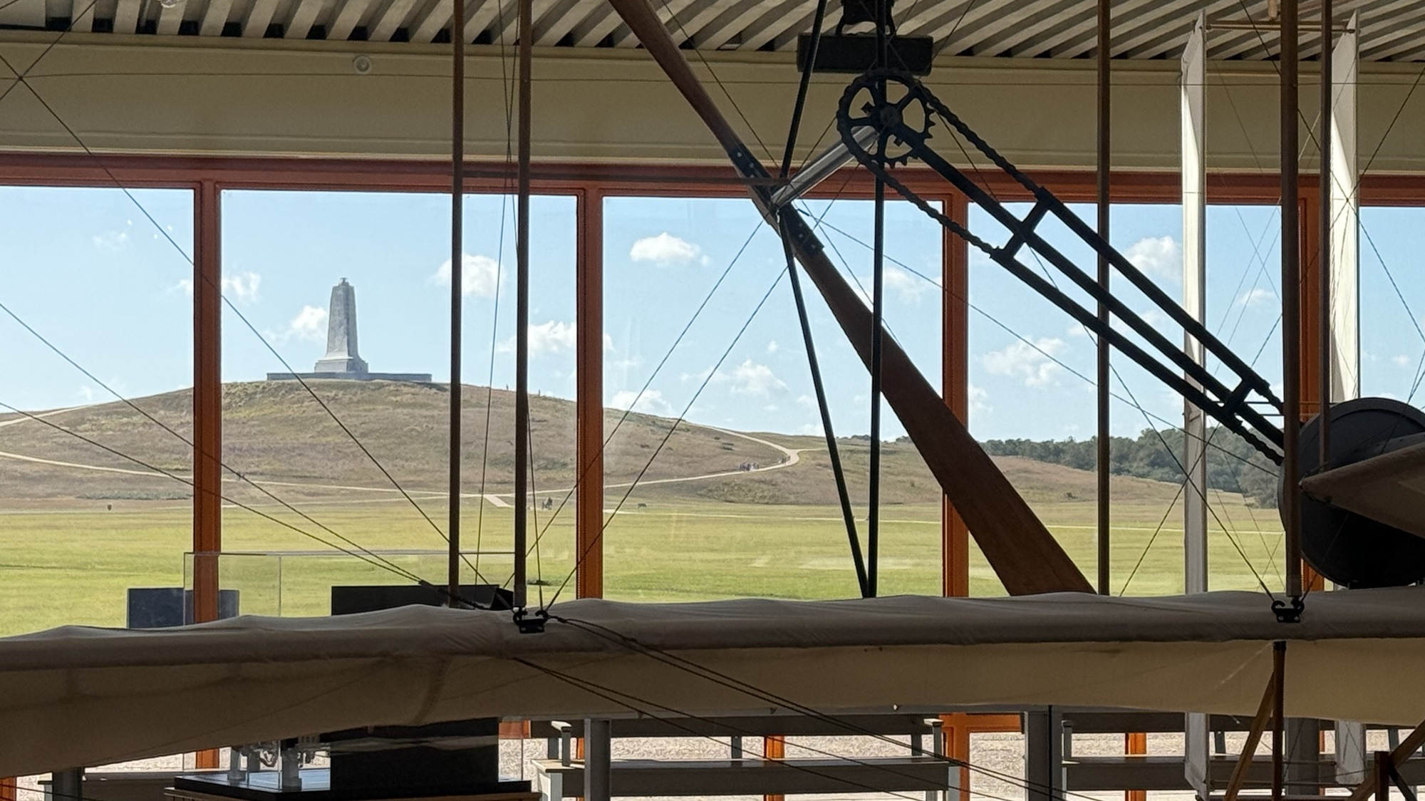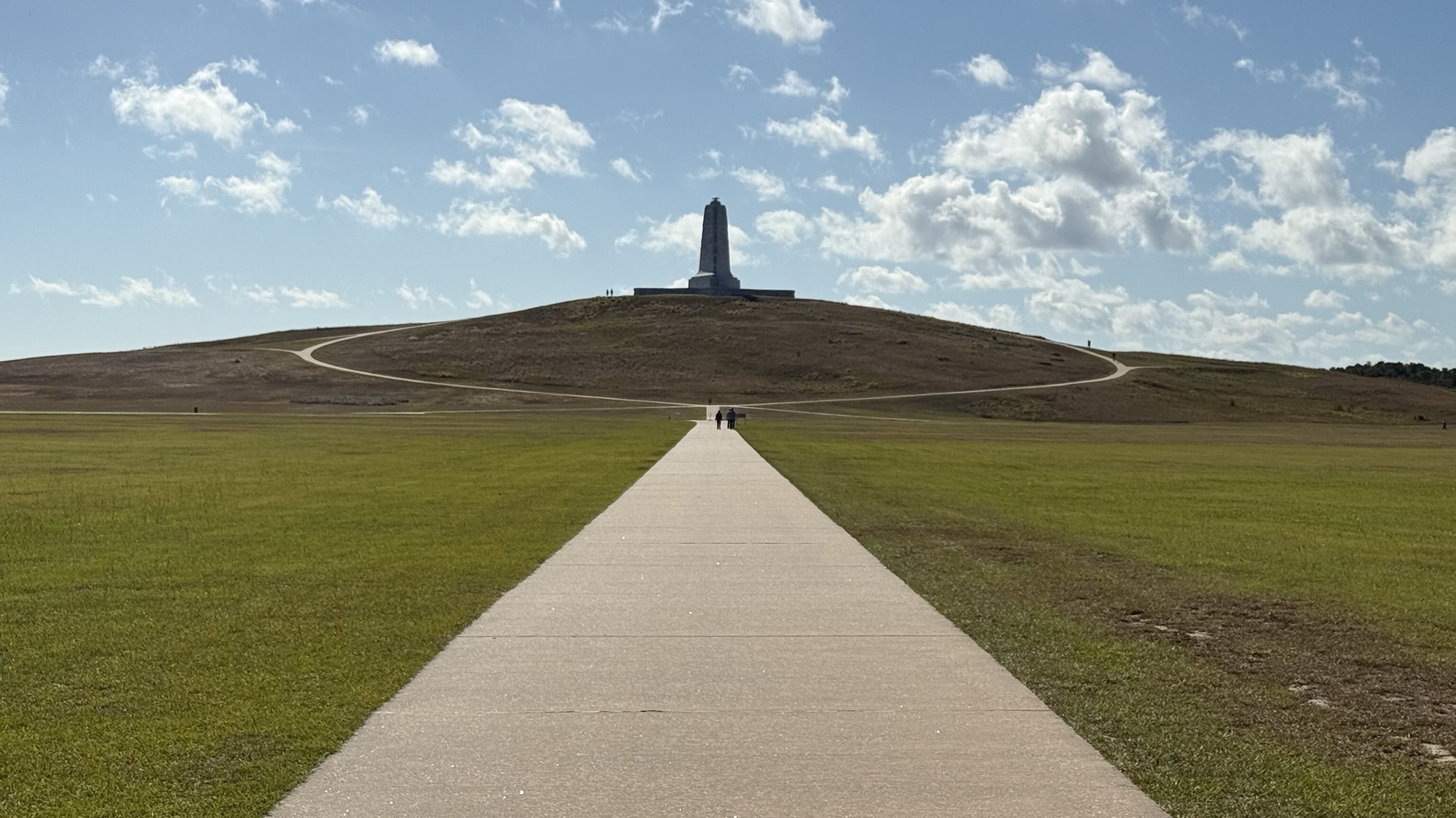 A sixty foot monument honoring the Wright brothers sits atop Kill Devil Hill, which is really just a ninety foot sand dune covered with grass. Many glider flights happened here before the first engine-powered flight by the Wright brothers.