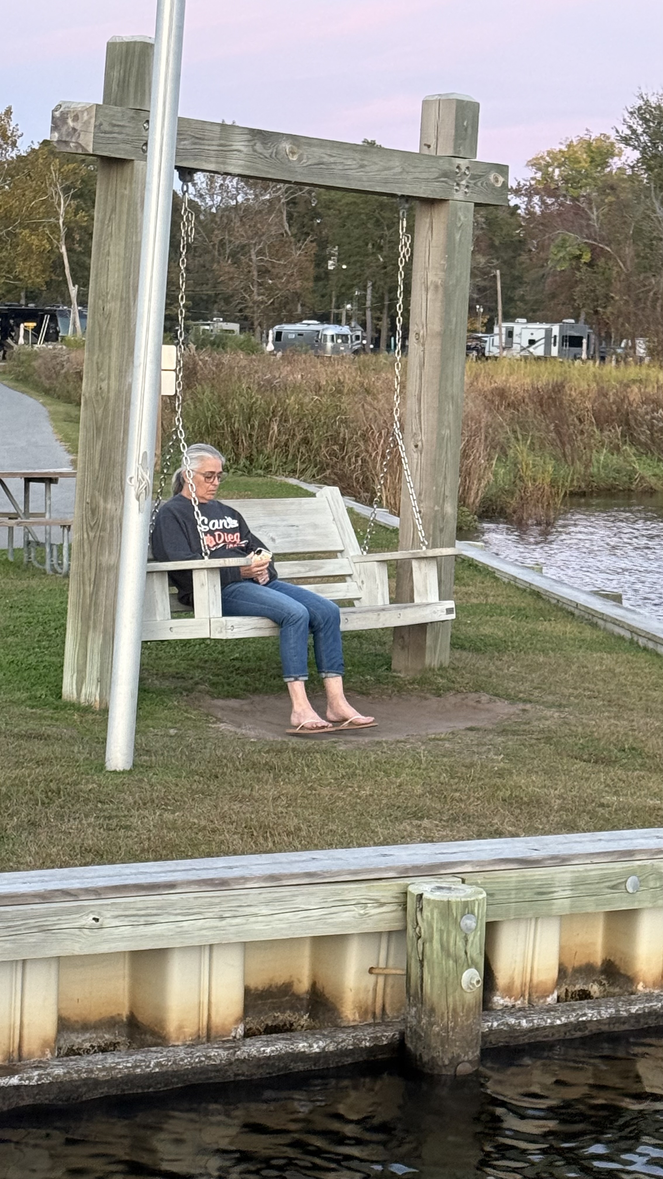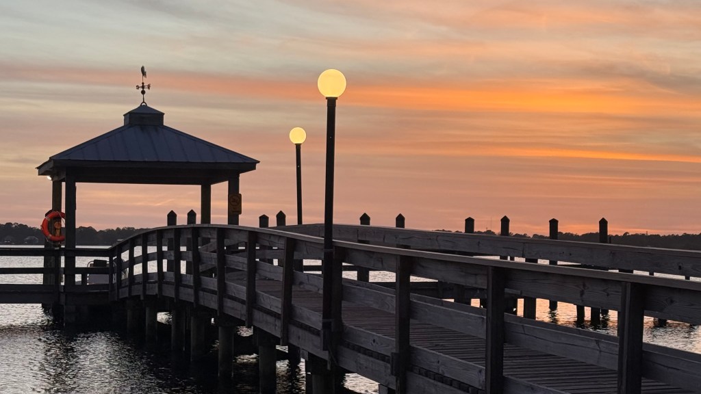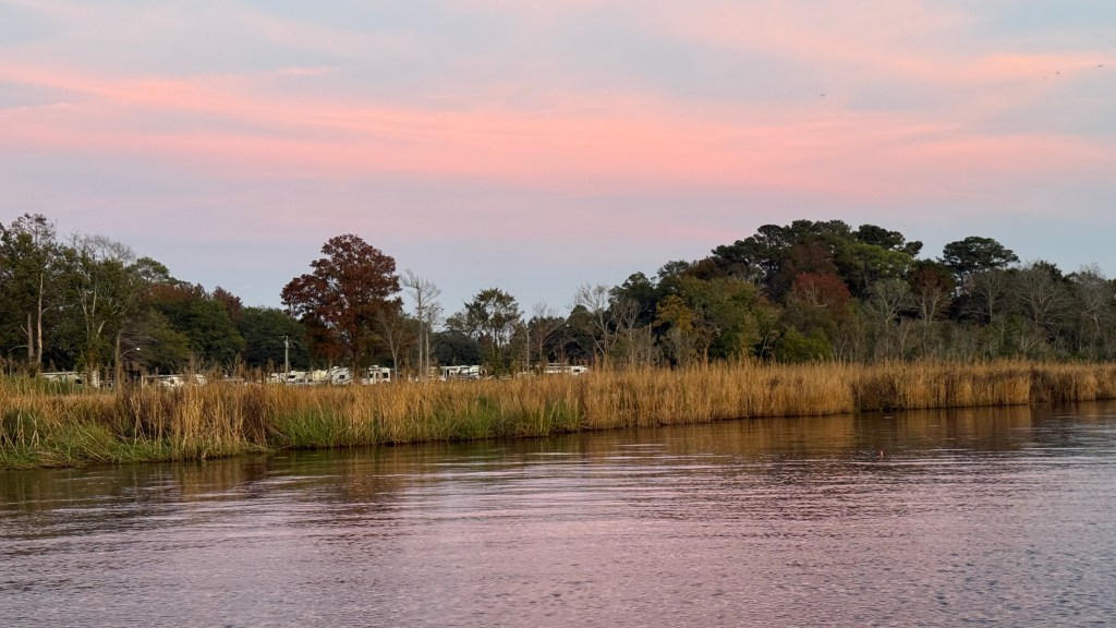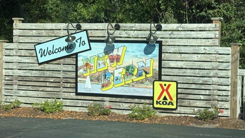 We arrived brimming with enthusiasm (as you can see) at one of the nicest KOA’s we’ve ever been to. It was so clean and so peaceful. In fact, this New Bern Kampground Of America was voted Best KOA in America for 2019! After setting up our campsite we walked down to the camp’s dock that extends out into the Neuse River…
