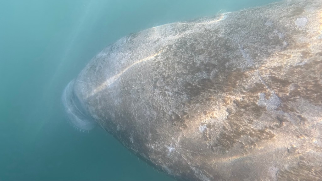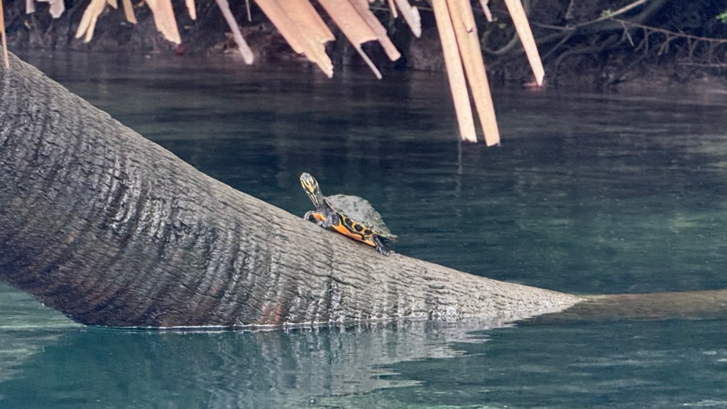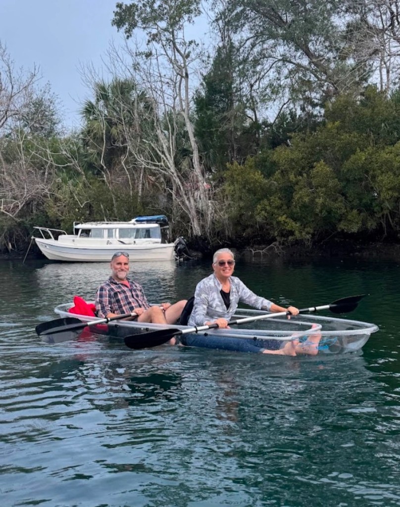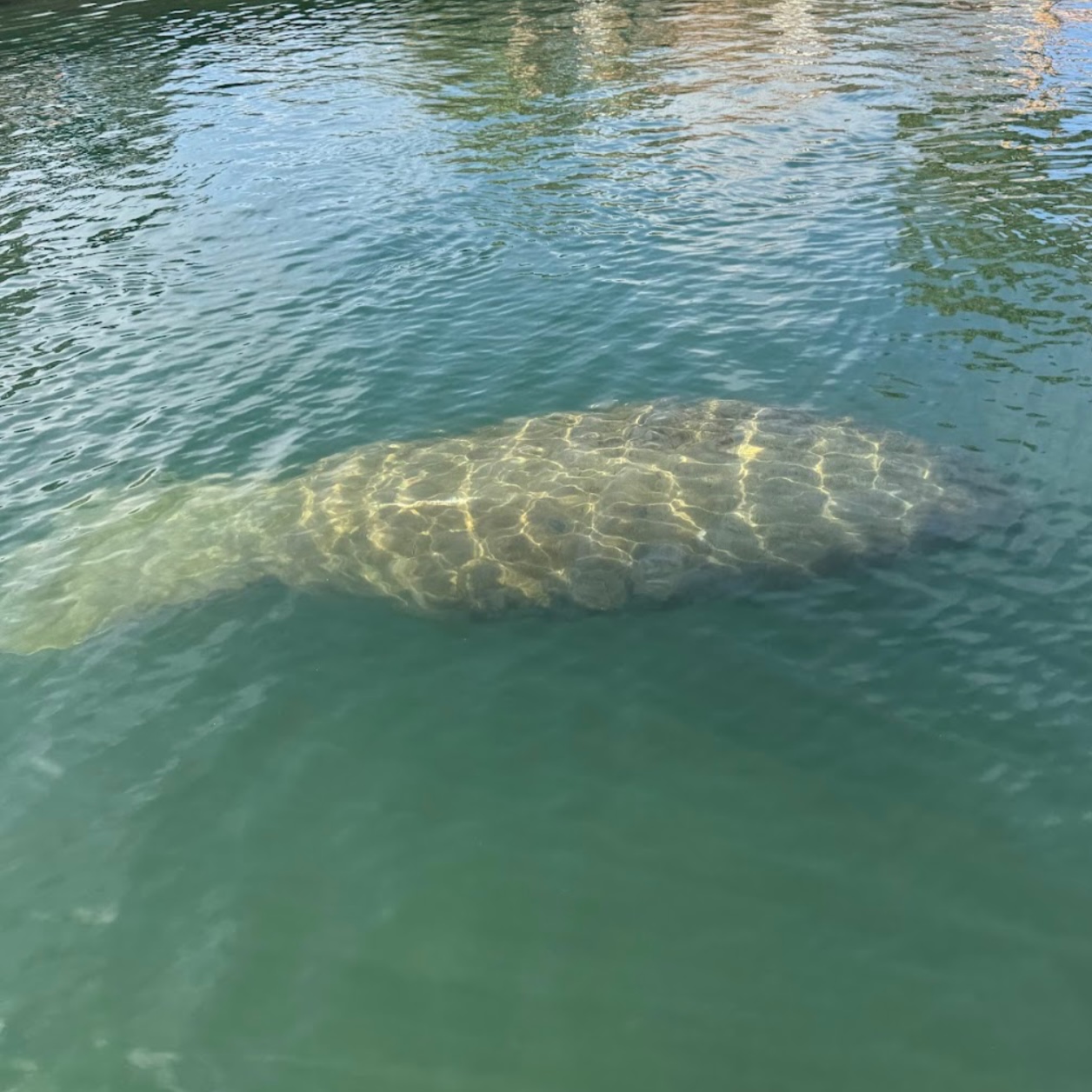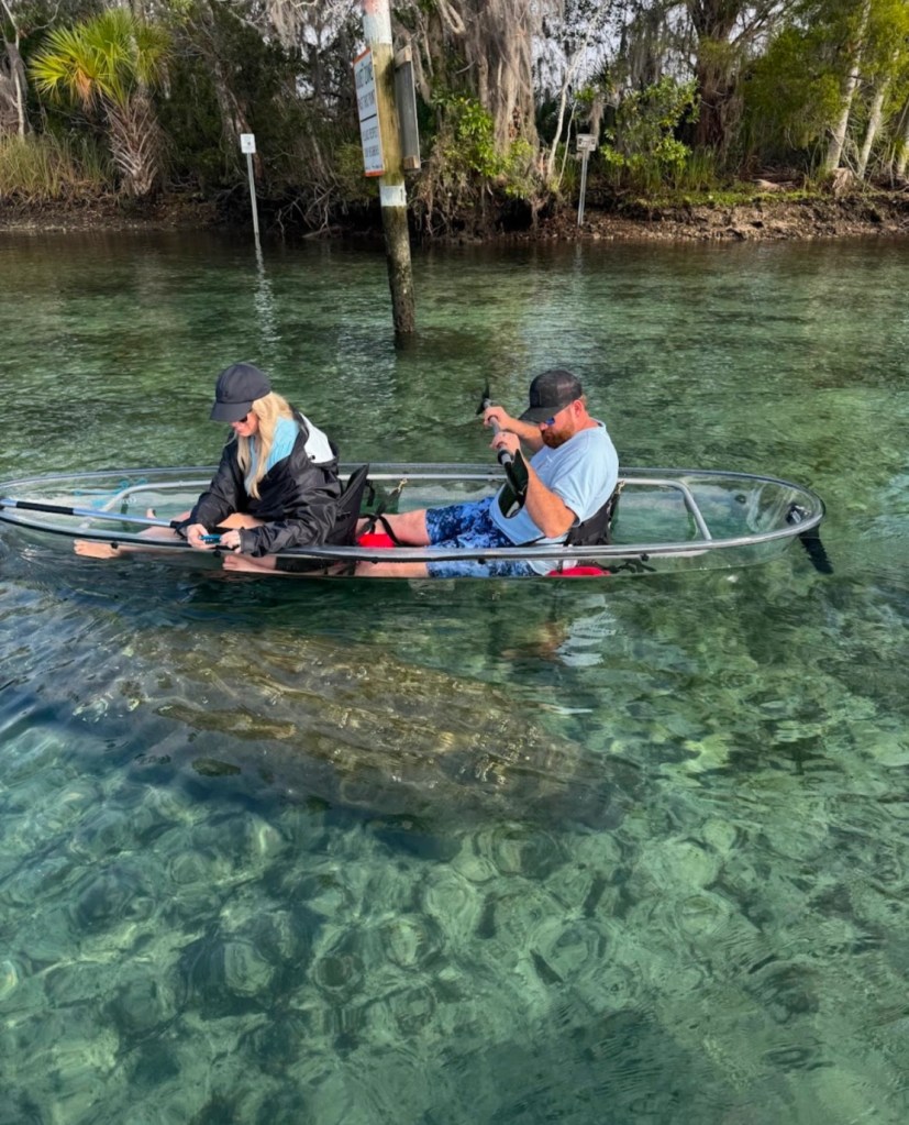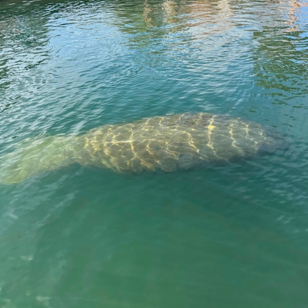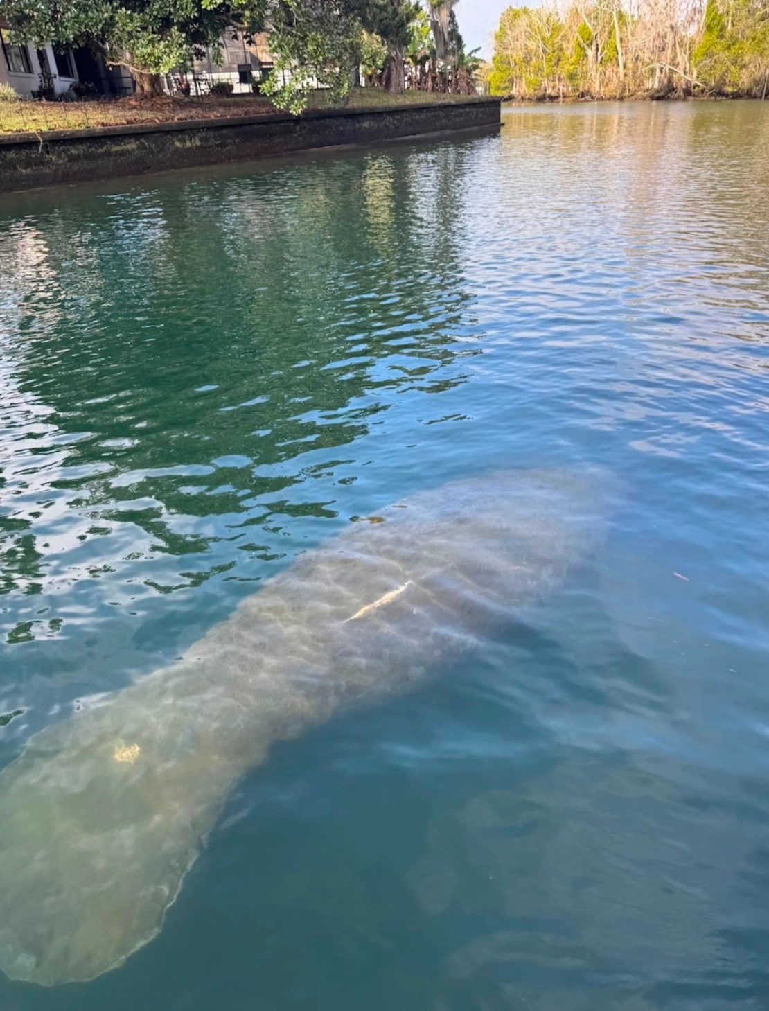 One Christmas gift that Treva gave me was a Clear Kayak Manatee Eco Tour in the town of Crystal River, Florida. An hour north of our domicile, we drove there the morning of New Year’s Eve. It was a little breezy and a little chilly on the open water, but once we paddled upstream the conditions were pleasant. We glided around on the water, checking out the scenery and the wildlife, for an hour or two. We saw turtles drying in the sun, some egrets frolicking at water’s edge, and cormorants surfacing here and there. The manatees that were underwater were a challenge to see because of the reflection of the cloudy skies. We started rowing back to our starting point, feeling a little disappointed, when…we were joined by this big female manatee! We know she was female because they grow larger than the male manatees. She had quite a few scars on her backside, which I suspect were from boaters. She glided along with us for about fifteen minutes, swimming along side us or going under our transparent kayaks. (Tapping on a picture will allow you to scroll through that group of pictures in greater detail.)