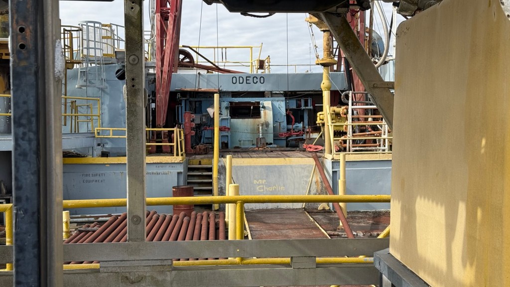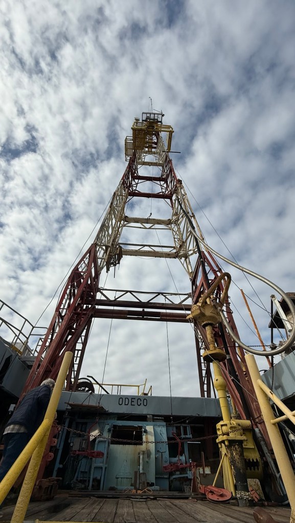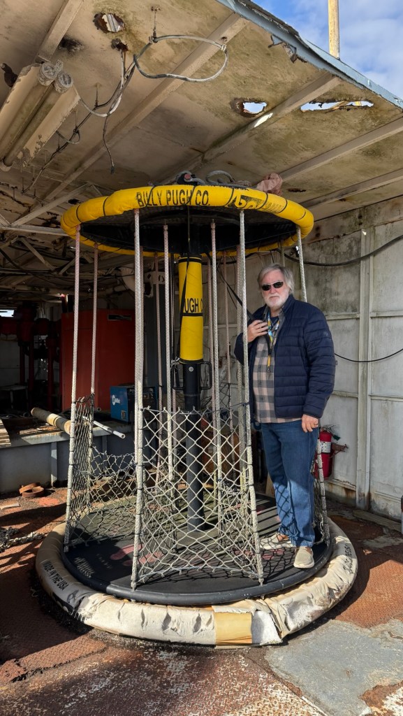 Bryce showed me what life is like on an offshore oil drilling platform like Mr. Charlie. He told me about all of the different jobs onboard, like the floorhands, also known as roughnecks, who do the hard manual labor like adding or subtracting pieces of drilling pipe that goes down into ground. He talked about the crane operator who would be up in the crane moving equipment around or the derrickhand, high aloft in the derrick tower guiding the drilling pipe sections through the “fingers” as they are raised or lowered during the drilling operation. There’s the roustabouts doing more technical manual labor and the rig manager overseeing it all. In between there’s also cooks, welders, and mechanics. On the technical side there’s the ballast control operator who maintains the oil rig’s position and stability; the drilling engineer who performs drilling tests and plans the exploration of new wells; and assisting him is the petroleum geologist who analyzes geological information that helps them identify new oil sites to explore. All of these people live a hard, lonely life away from land but are compensated well for their time on the well.