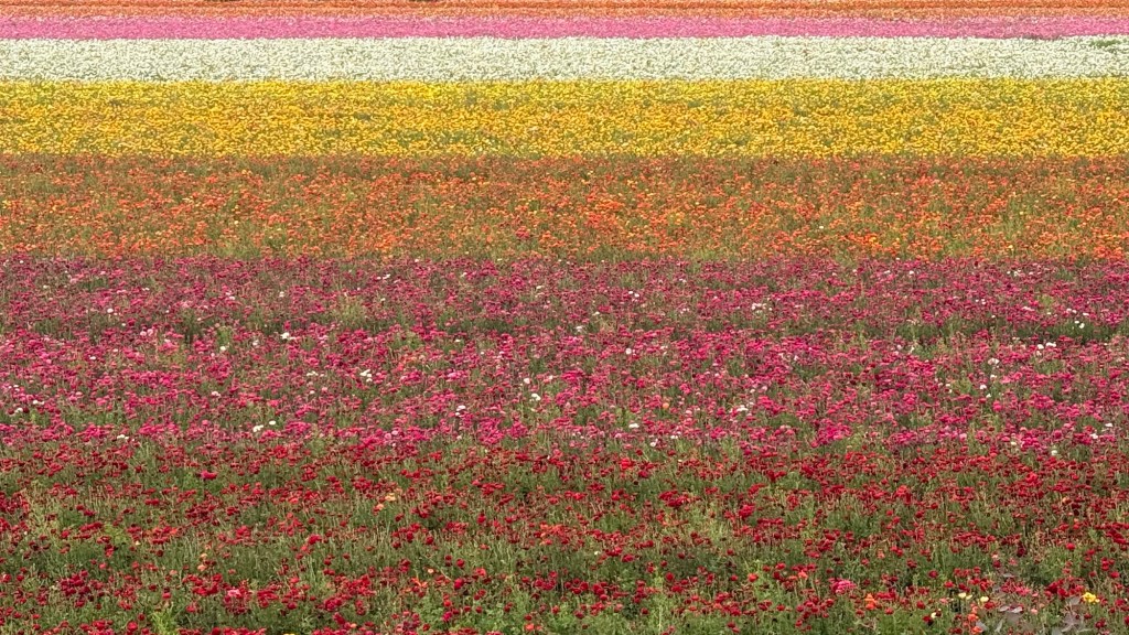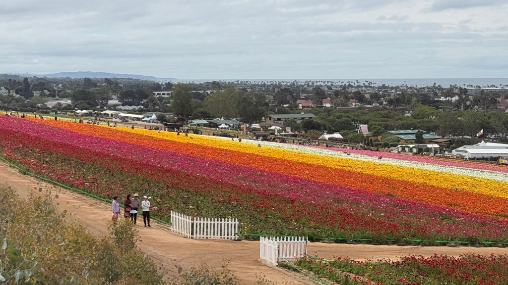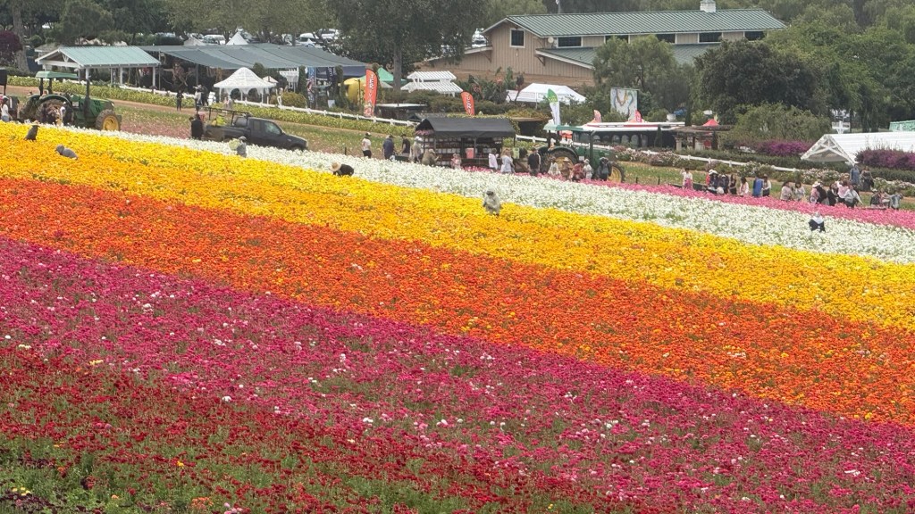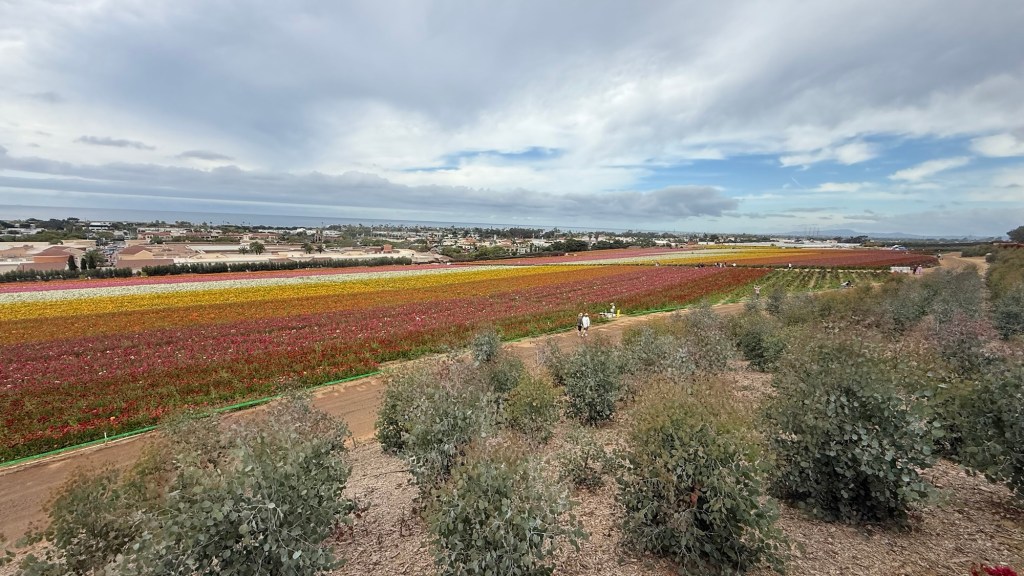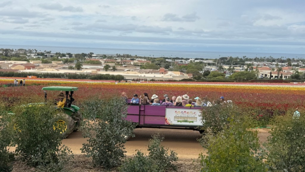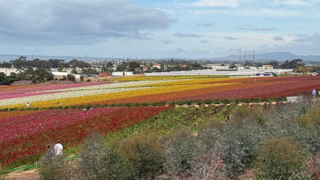 Today we drove a half hour north to Carlsbad to see their famous Flower Fields. Located between the azure Pacific Ocean on the west and crowded Legoland to the east, this massive flower garden has become quite the tourist trap. They have a grand entrance, a large parking lot, and continuously running wagons pulled by tractors that will drive you around the perimeter of the fields all for the not-so-nominal fee of twenty-seven dollars. If you really love flowers and tip-toeing through the tulips then I suppose this would be a pleasant place to frolic in the April sun. The flowers there are mostly ranunculus, which are basically in the “buttercup” family and this is the largest ranunculus flower field in the world. 🌺