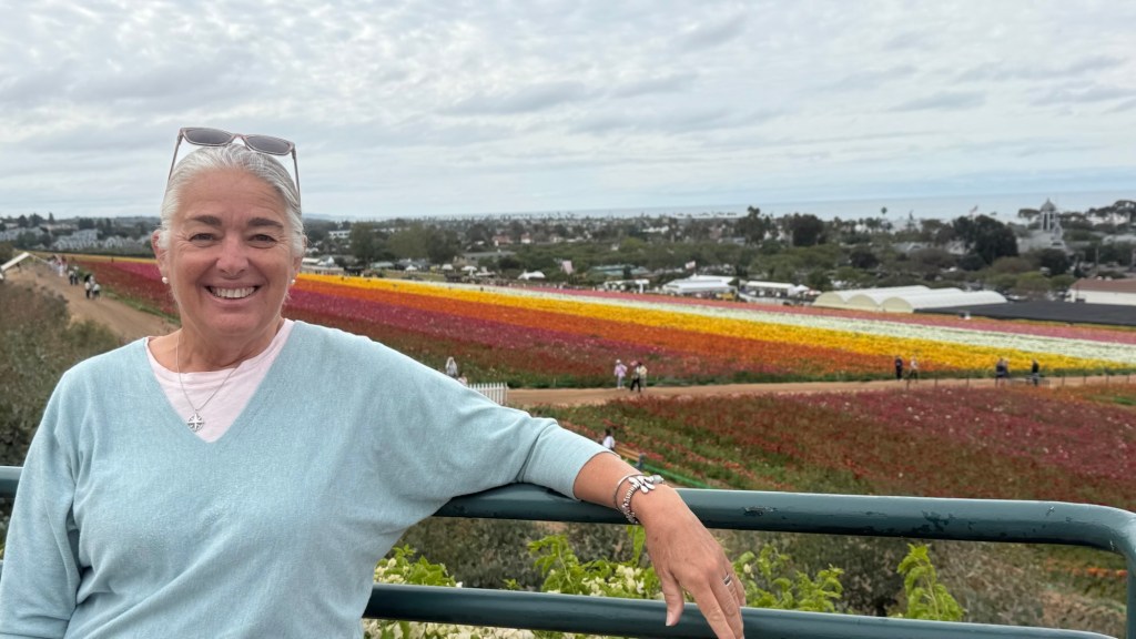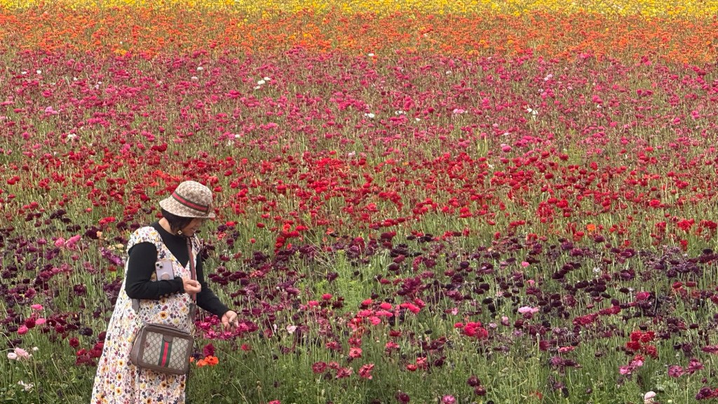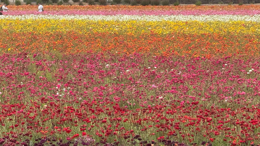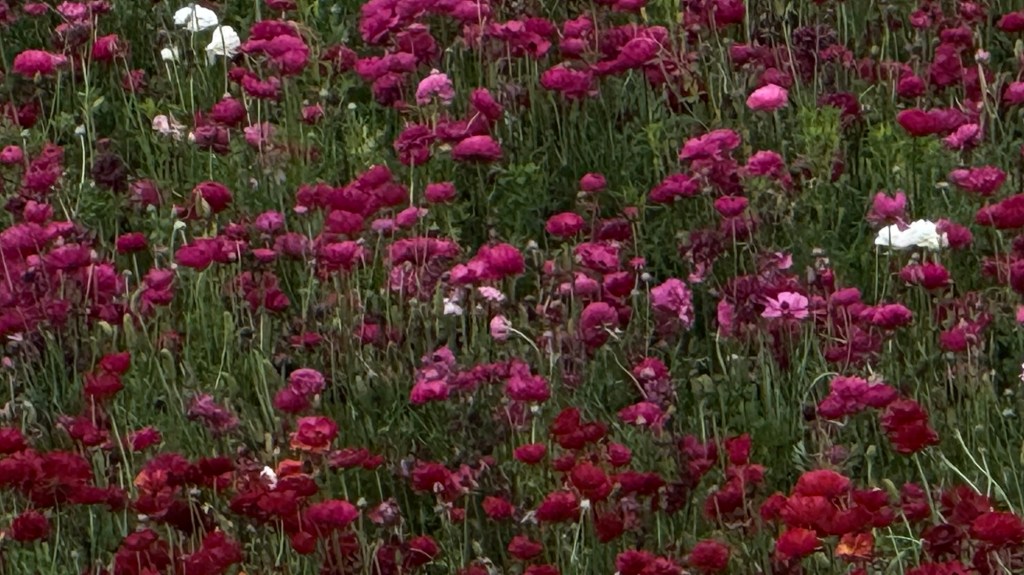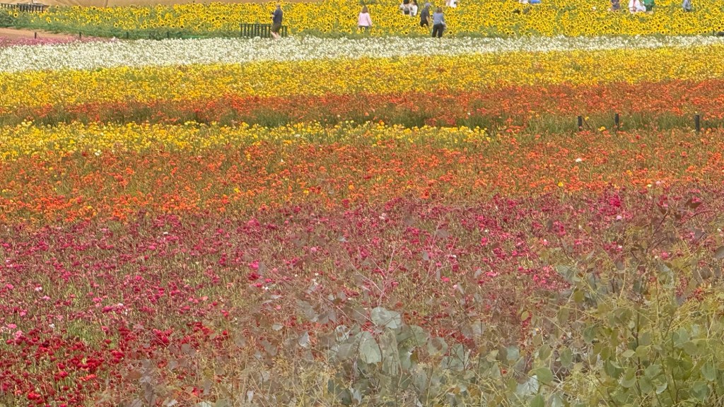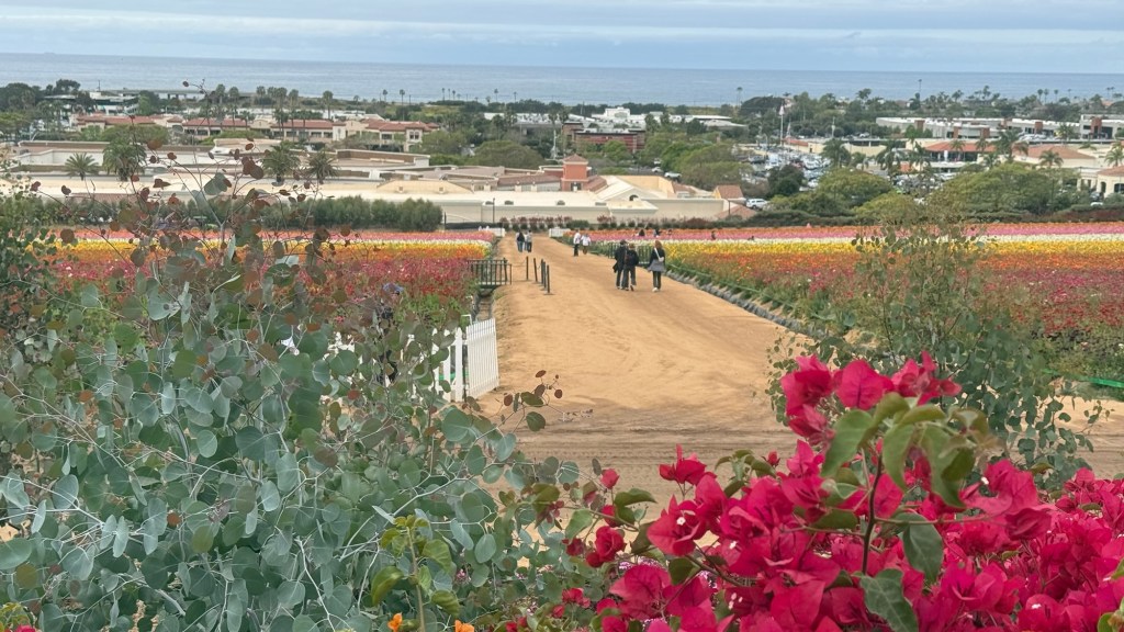 Today we drove a half hour north to Carlsbad to see their famous Flower Fields. Located between the azure Pacific Ocean on the west and crowded Legoland to the east, this massive flower garden has become quite the tourist trap. They have a grand entrance, a large parking lot, and continuously running wagons pulled by tractors that will drive you around the perimeter of the fields all for the not-so-nominal fee of twenty-seven dollars. If you really love flowers and tip-toeing through the tulips then I suppose this would be a pleasant place to frolic in the April sun. The flowers there are mostly ranunculus, which are basically in the “buttercup” family and this is the largest ranunculus flower field in the world. 🌺