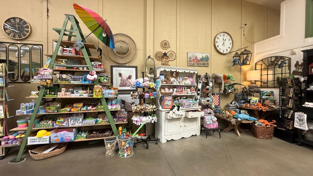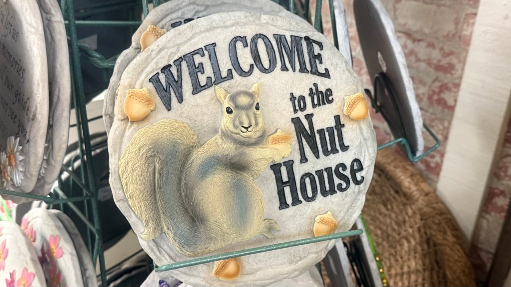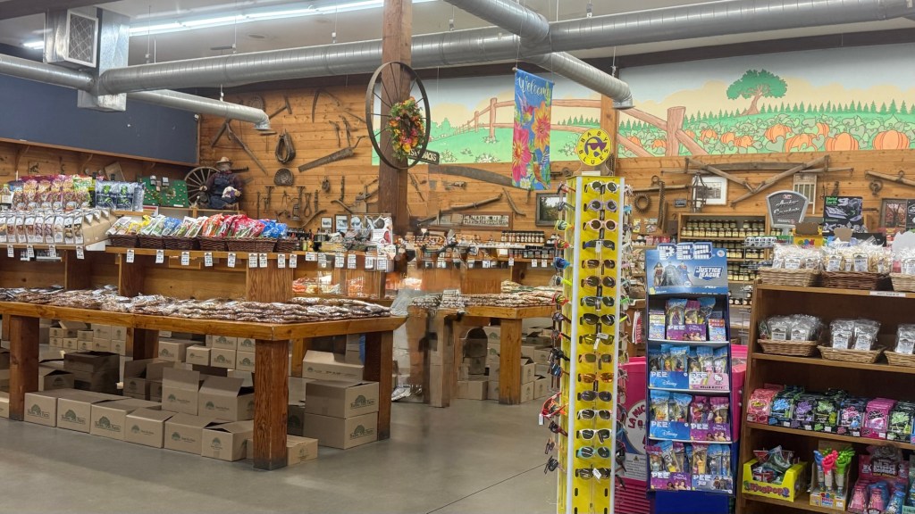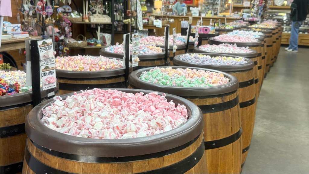 Then we headed inside the store. As you can see by the pictures they have a whole lot of everything! Barrels of salt water taffy, display cases full of homemade chocolate, slabs of sweet homemade fudge, aisles of assorted nuts, walls of signs, cards, toys, trinkets, and many other assorted gifts. Treva bought a bag of chocolate-covered pretzels and I bought a bag of roasted cashews. 🥜